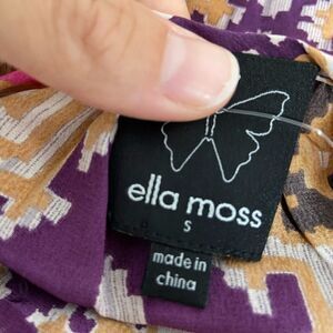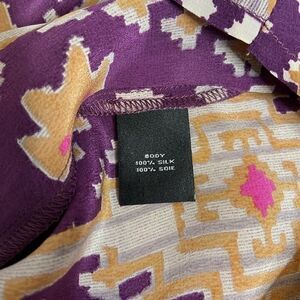 Beautiful lightweight 100% silk dress by Ella moss. Features great geometric print and defined elastic waist. Excellent preowned condition without any significant flaws. Lying flat armpit to armpit approx 18” across, waist approx 12.5” across and top of shoulder to bottom hem approx 36”. All measurements are approximate