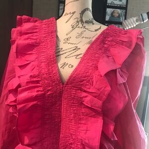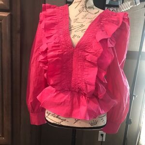 New without tags Ellatuse pink ruffle V-neck crop top blouse in size small. V-neck and ruffled detail in back. Made of 65% rayon, 32% nylon, and 2% spandex. Measurements: 21 inch length, 25 inch sleeves, 17 inch pit to pit. Stretch waist.