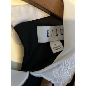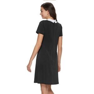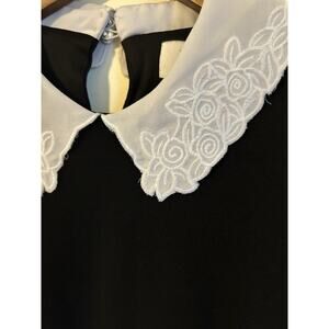Chic black mini dress. Features a delicate white lace collar. Short sleeves for a stylish look.