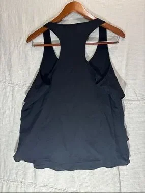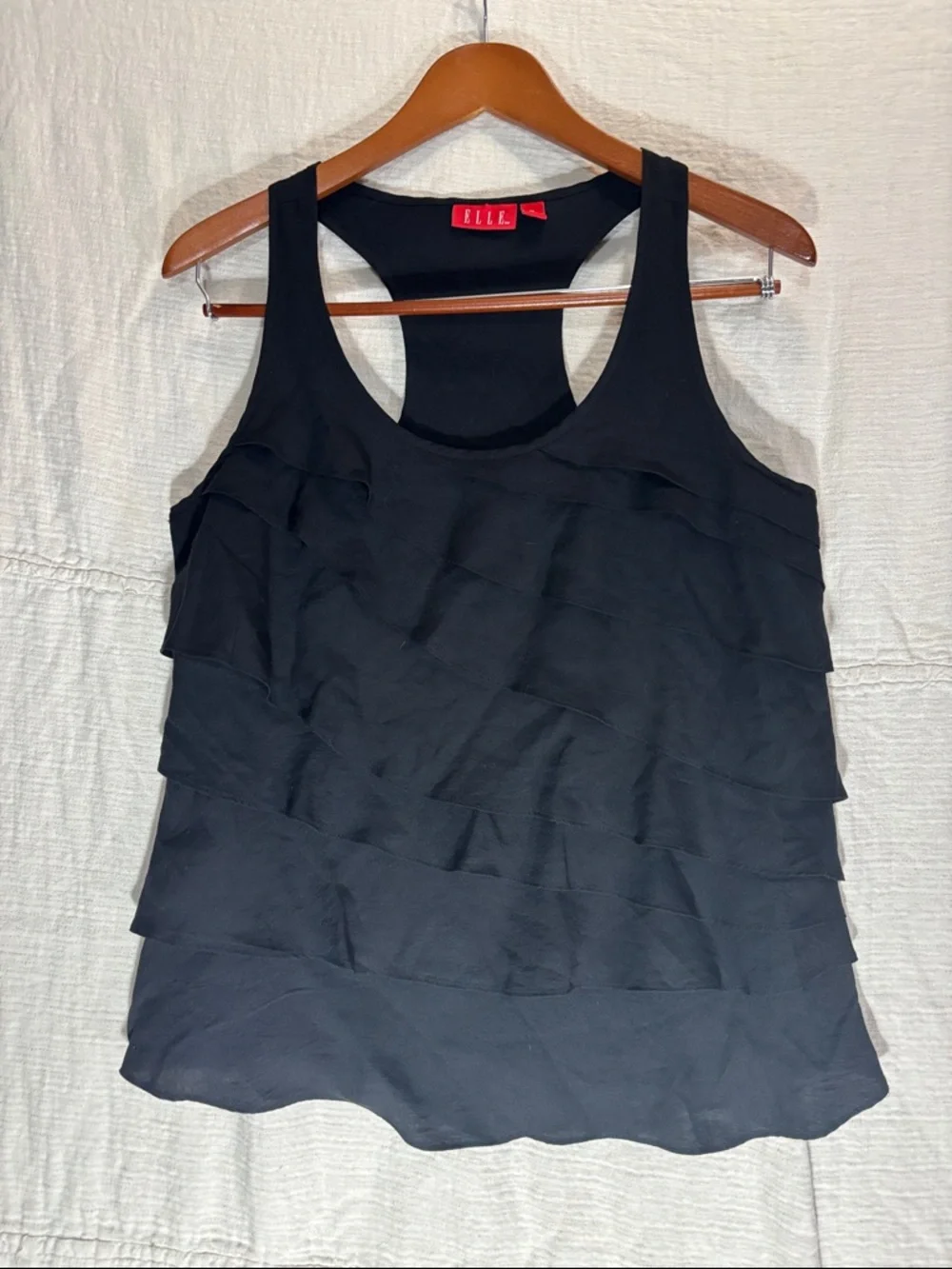 Sleeveless racerback tank with tiered ruffle layers. Soft, flowy fabric for easy movement. Simple, versatile silhouette for day or night wear. Measurements: pit to pit is 18 inches and length is 25 inches