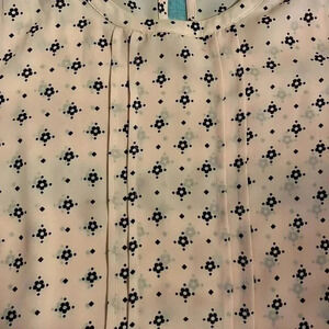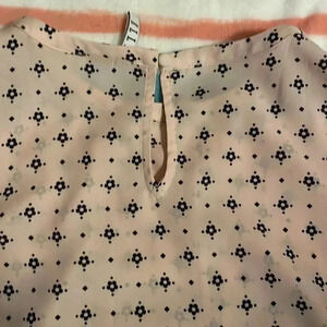 Dusty pink with navy blue design. Ruffle cap sleeves. Dress it up or dress it down.