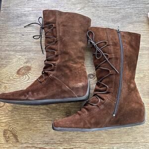 Elle Brown Chestnut Suede Womens Size 7-7.5 Boot Lace Up Square Toe Mid Calf
