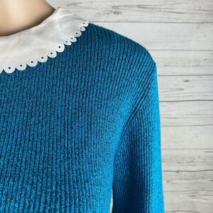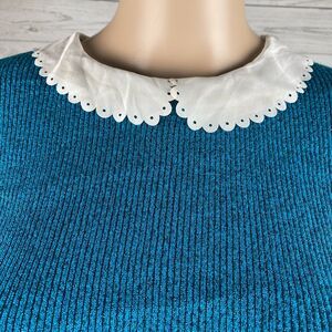 Elle Faux Layer Sweater Large Sparkly Teal Blue White Peter Pan Collar Rib Knit