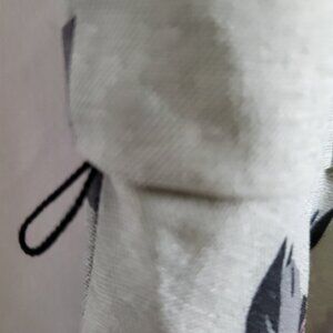 Pretty floral colors over a gray background. Zip closure in the back with a hook also. Sleeveless. There are belt loops intact on the sides, but I do not have a belt (you can add your own or clip off those little loops!). There are two pleats at the neck front.