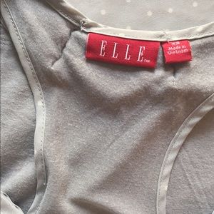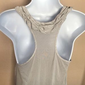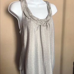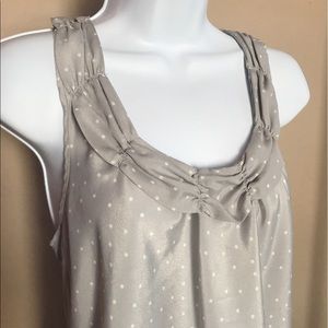 Elle brand racerback tank blouse, size XS. Cute white polka dot pattern on the front, the back is plain gray. Ruffle detail around the collar. Flowy fit. The material of the front is 100% polyester, the back is 100% rayon. Perfect for work/business wear.