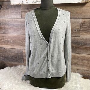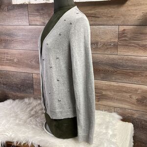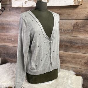 Elle Gray Rhinestones Long Sleeve Button Up Sweater, Size Large,
