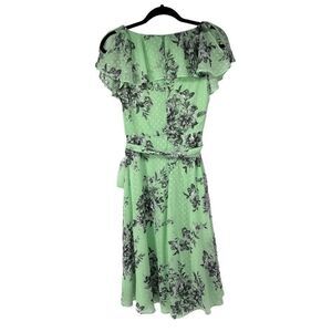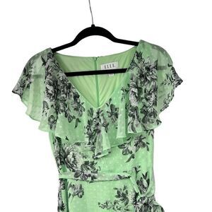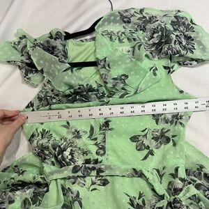 Elle Green Black Floral Ruffle Detail Swiss Dots Dress. Size extra small with measurements in the pictures. Gently used condition with no rips or stains.