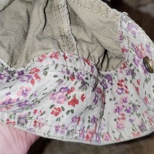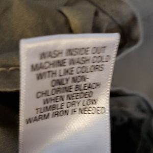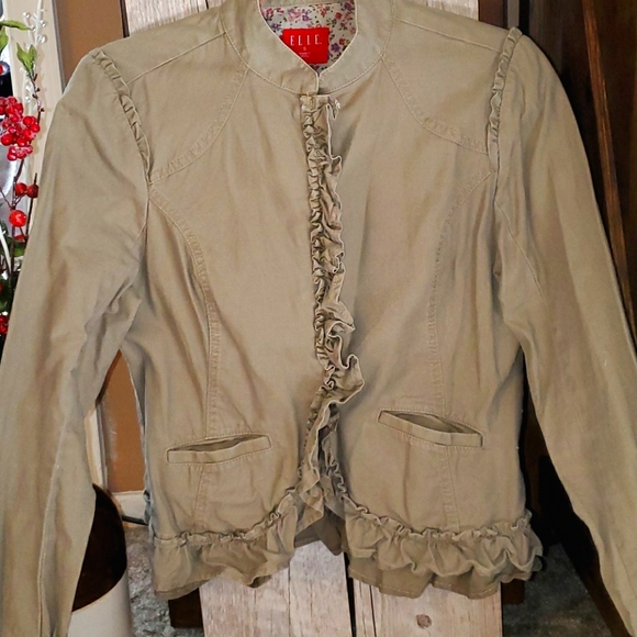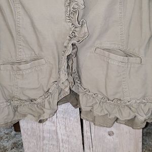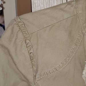 Ruffle details around sleeve cuffs, shoulders, bottom hem, and button closure