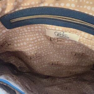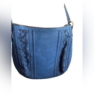 NWOT gorgeous blue cross body bag about 13 inches across and 13 inches long - adjustable strap with brass hardware