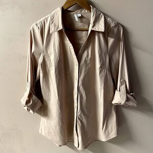 Cute light pink button-down shirt with a collar, and rolled sleeves that can be unrolled. In great condition! The color is most like the sleeve measurement picture. Great for the office or can be worn with jeans too and sneakers or a cute heel. Approximate measurements shown in photos! Feel free to ask questions or make an offer!