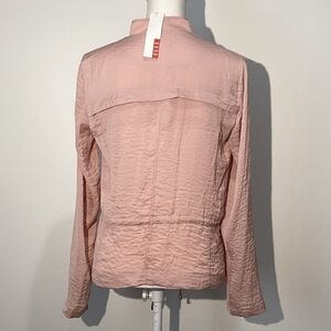 Chic utility jacket with ruffle detail. Light pink hue. Stylish and versatile.