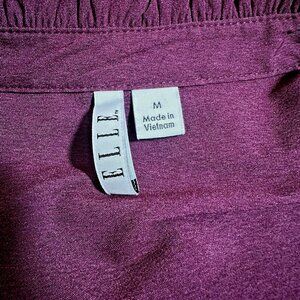 Elevate your wardrobe with this Elle Women’s blouse in a rich plum hue, blending quiet luxury with romantic flair. Featuring a flattering V-neckline, soft ruffle trim, and roll-tab sleeves, this versatile button-front top transitions effortlessly from desk to dinner. Crafted from a stretch blend of polyester, nylon, and spandex, it offers lightweight comfort and easy care. Perfect for fall layering, workwear chic, or cozy luxe styling. Size M. Made in Vietnam. Machine washable.