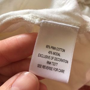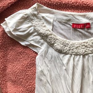 Elle ruffle cap sleeve top in size large. Thin and lightweight, this top is perfect to wear in a business causal setting. Cute under a blazer, or even paired with nice black bottoms and your best heels. The color is off white or ivory. The neckline has fabric that creates interesting texture to the whole overall look. Top measures 26 inches long.