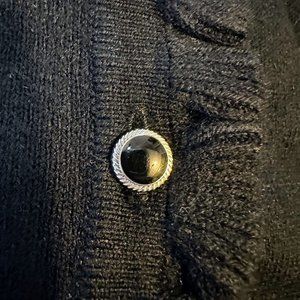 Item Description: Elle black cropped cardigan, ruffle fringe on the front placket and ruffle cuff edges, black and sliver buttons