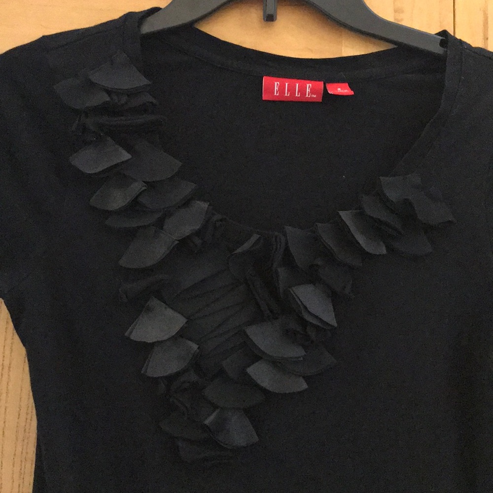 Dressy short sleeve t-shirt with asymmetrical ruffle detailing on the front of the shirt. Size small, but runs on the smaller end. Please see pics for measurements.
