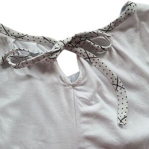 Adorable off-white and black Elle sleeveless blouse with checkered and polka dot designs, ties behind your neck with a keyhole accent in the back, size XS. Great for work or just wear with jeans!