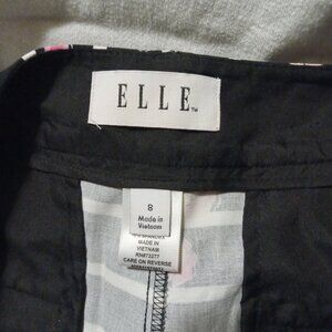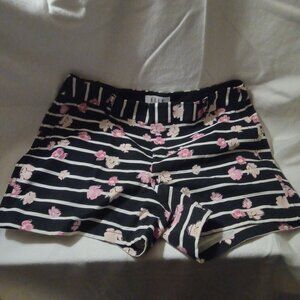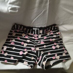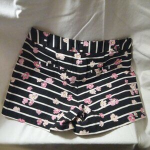 Elle black and white striped floral shorts, pink flowers, cotton/spandex fabric, like new condition, no loose threads, hems in perfect condition, no fading, no stains, no abnormal stretching or shaping, no worn spots in fabric, mid-thigh length, zipper and clasps in perfect working condition, belt loops in perfect condition
