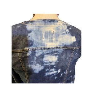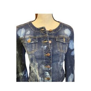 Acid wash denim jacket, button closure, side slip pockets, round no collar, top pockets, stretch
