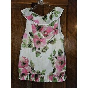Elle White Green Pink Floral Ruffle Mesh Sheer Blouse Top Womens Large