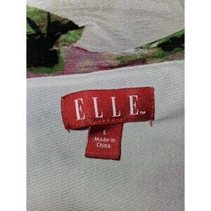 The Elle White Green Pink Floral Ruffle Mesh Sheer Blouse Top in Women's size Large is a stylish and trendy addition to any wardrobe. Made of polyester mesh fabric, this blouse features a beautiful floral pattern in white, green, and pink colors. The ruffle accents add a touch of bohemian flair to the top, while the short sleeves and round neckline provide a comfortable and chic fit. Perfect for a casual day out or a night on the town, this blouse is a versatile and fashionable choice for any occasion.