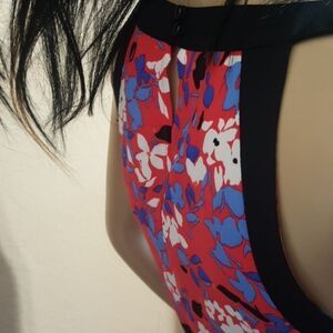 This dress features a classic halter neckline with bold black trim detailing around the neck and waist, creating a flattering, defined silhouette. The print is a striking mix of red, bright blue, and white/pink flowers.