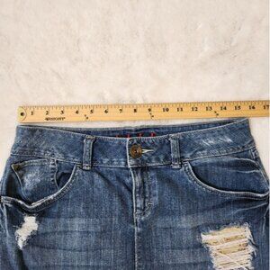Elle Womens Stretch Blue Denim Mini Skirt Distressed Gold Sequin Detail