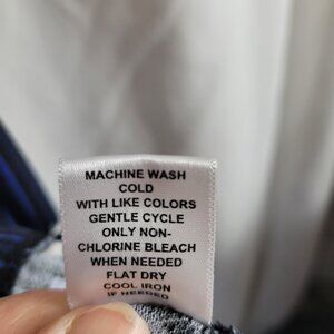 Round neck, longer in length. Navy blue background with lighter blue stripes and a floral and medium blue pattern over that.