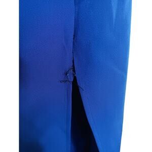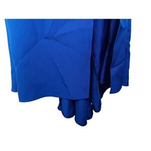 Blue chiffon (100% Polyester). A-line. One shoulder. Long sleeves. Side zipper closure. 2" train at back hem. I