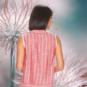 This is so comfy for summer! Can pair with lots of things! Kinda a faded red color with white stripes and white lace in shoulders
