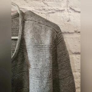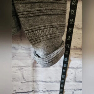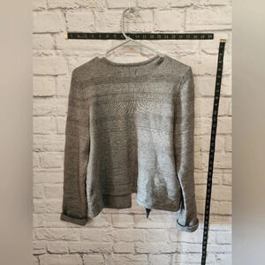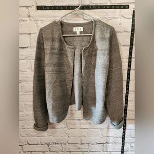 This Elle cardigan is a gray, open-front sweater with a relaxed and cozy design. It features a textured knit pattern in horizontal stripes, adding visual interest and a subtle contrast to the otherwise simple design. The cardigan has long sleeves with slightly rolled cuffs, which give it a casual and laid-back vibe. The neckline is rounded, and the fit is slightly cropped, ending around the waist, making it ideal for layering over various outfits. This piece is versatile and suitable for cooler weather, providing both comfort and style.