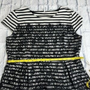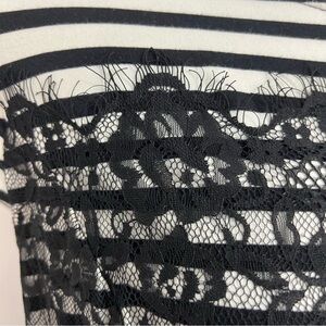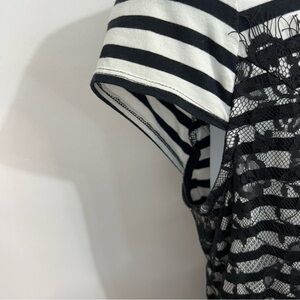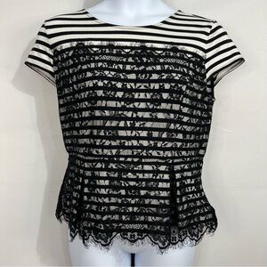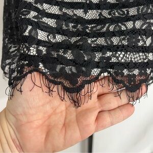 Excellent preowned condition. This is a modal blend shirt and super soft with lace over top. This is also a peplum bottom and pleated. This has a little eyelash fringe on the edges of the lace. Very flattering and with a side zip. Photos also contain measurements. This comes from a smoke free home and will be mailed same business day