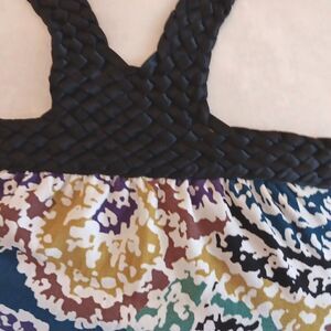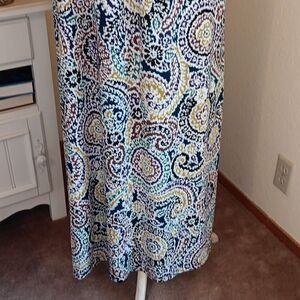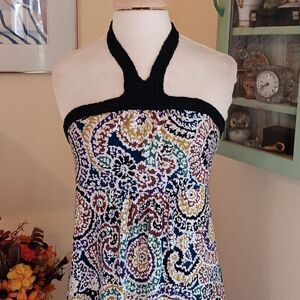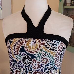 Soft knit maxi. Abstract graphics. There's a woven halter strap, and elastic shirring on the back for fit. Size M 34-40 at chest, 30-34 under chest. 46 at hips. 50 long from under arm to hem.