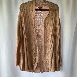Elle XL open front. The color is blush with tiny gold stitching throughout. The sweater is very unique and beautiful open front. I’ve shown measurements but the sweater can be stretched to almost double that… Very giving material. Like new condition. Smoke free and pet free home