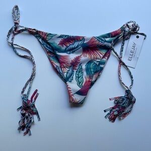 Jordyn bikini swimsuit bottom in a tropical print from Ellejay. Braided side ties with fringe at the ends.
