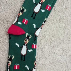 Green Ellen DeGeneres sock with reindeer and red toe, heel, and band
