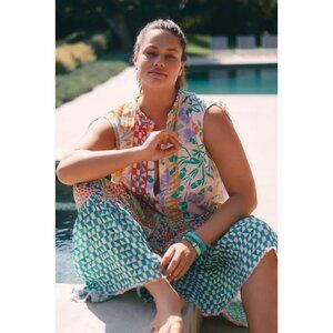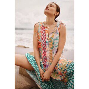 Ellen Merchant For Anthropologie Shoulder-Tie Button Dress Colorful Patchwork L