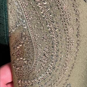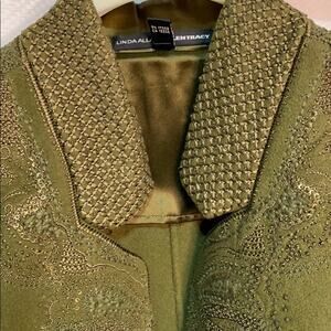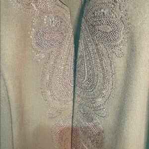 Ellen Tracy 💯 wool olive jacket with bejeweled accents at lapel area, front opening sides and cuff ends. This is just stunning g and a true find in nwot condition . Follow game contemporary mandarin collar spring winter fall boiled wool pockets coastal clean line cocktail dressy black tie farmhouse vintage retro y2k 80’s 90’s brocade silk lining embroidered paisley