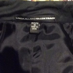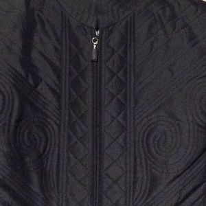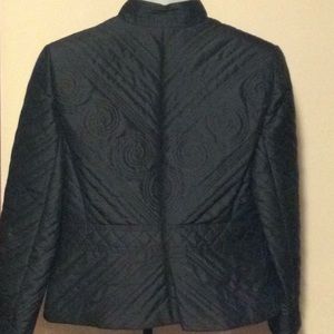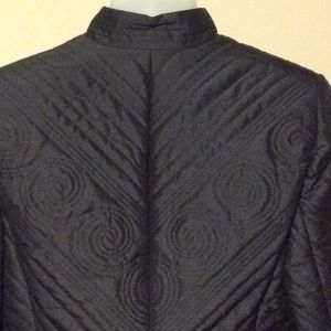 Size 10 Petite. Black fancy quilted jacket. Zipper front, mandarin collar. Very unique and detailed piece.