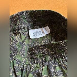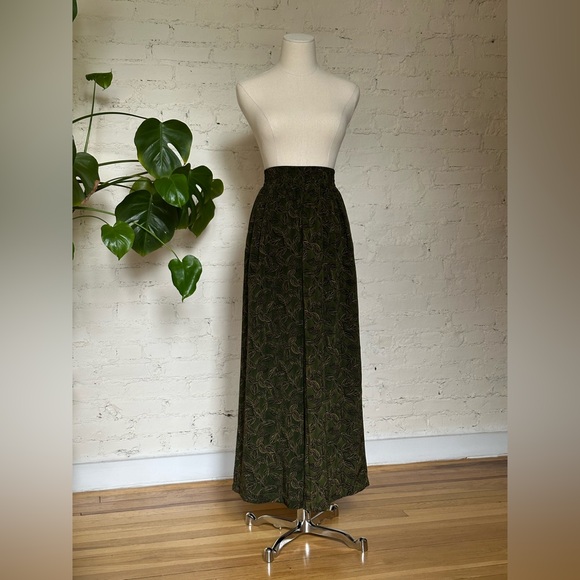 Incredible Linda Allard for Ellen Tracy dramatic palazzo pant crafted in 100% silk, made in Hong Kong. What makes this pant special is the abstract leaf print in black and gold against the deep, olive green background. Perfect for the minimalist who is interested in playing with prints (or the maximalist who loves a statement piece). Features an elastic waist that measures 11.5” laying flat (and stretches to 15.5” laying flat). Exceptional quality and contemporary look and feel.