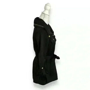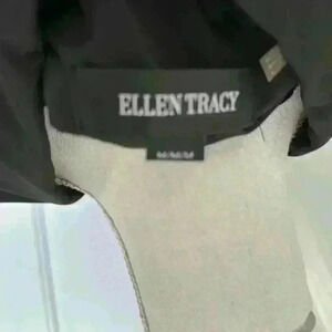 Ellen Tracy Black Jacket Size Medium NWOT. This beautiful jacket has hold hardware. A tie belt. Built in hood in collar. First true to size. Sleeves can be undone to full length.