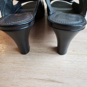 Ellen Tracy open-toe sling-back black heels. Very good condition. Very little signs of wear. Genuine leather upper with decorative rivets and cross pieces that look like elastic but not all of this elastic stretches. Stacked heel is 3 inches tall. Decorative white top stitching around edges.
