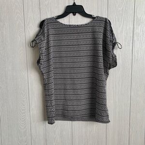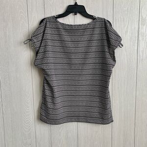 Ellen Tracy Black White Print Round Neck Short Sleeve Open Shoulder Top Size M