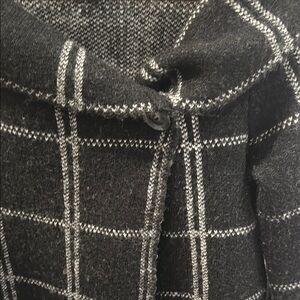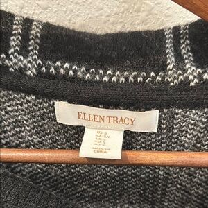 This Ellen Tracy cardigan features a classic black and white design, crafted from a soft knit material. Its relaxed fit and full-length sleeves offer a comfortable and stylish layering option. The timeless geometric pattern adds a touch of elegance to any outfit.