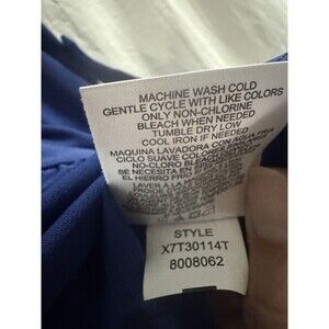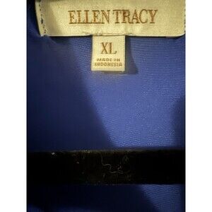 The product is a stylish Ellen Tracy blue career blouse in size XL. It features gold button-down detailing, adding a touch of sophistication to the classic design. The blouse is made of down fabric, making it comfortable and cozy for everyday wear or dressed up in the office. Perfect for professional women looking for a versatile and chic addition to their wardrobe.