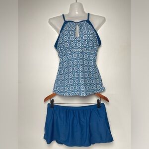 Ellen Tracy Blue Geometric Tankini Top Swim bikini with skirt set Women 10 Pads