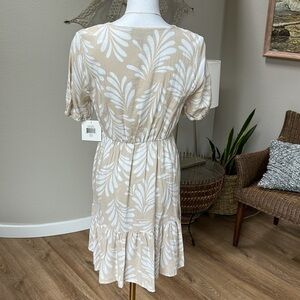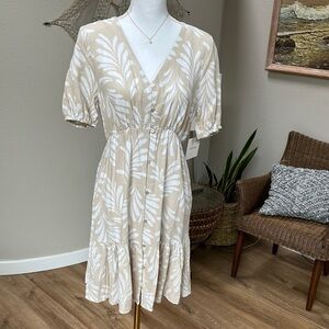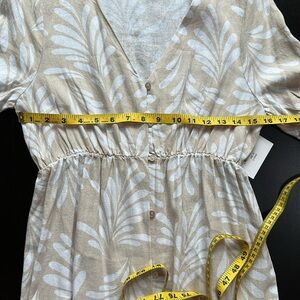 New with tags. Linen and Viscose blend. Functional buttons. Elastic waist. Ruffle hem. Neutral cream and white fern pattern. SZ CS. Please confirm measurements approximate laying flat in photos as Poshmark does not accept returns for fit issues. Please scroll to see all eleven photos and one video.