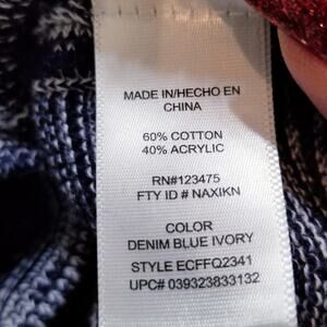 Ellen Tracy Casual Sweater Cotton Blend, Color Denim Blue / Ivory, Size L; Material - 60% Cotton, 40% Acrylic; Care - Machine Wash Cold, Dry flat; Made in China; Pullover, Round Neck, Long Raglan Sleeve, Tight Knit, 3 inch side Seam Slit,