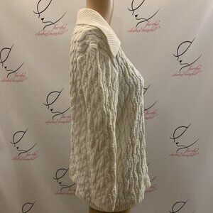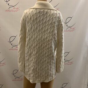 Elegant cable knit design. Large buttons. Cozy and stylish. Reposting as was originally listed as a large is a beautiful sweater just not a large is a small/medium so reposting for someone to enjoy.