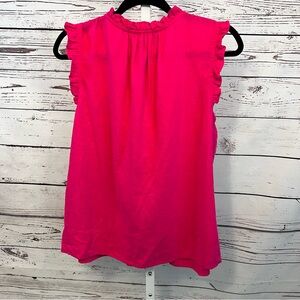 Bright fuchsia blouse with playful ruffles. Sleeveless design for a fresh look. Perfect for casual or dressy occasions.