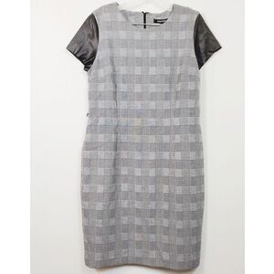 Ellen Tracy Glen Plaid Faux Leather Sheath Dress Black Gray Career Size 12